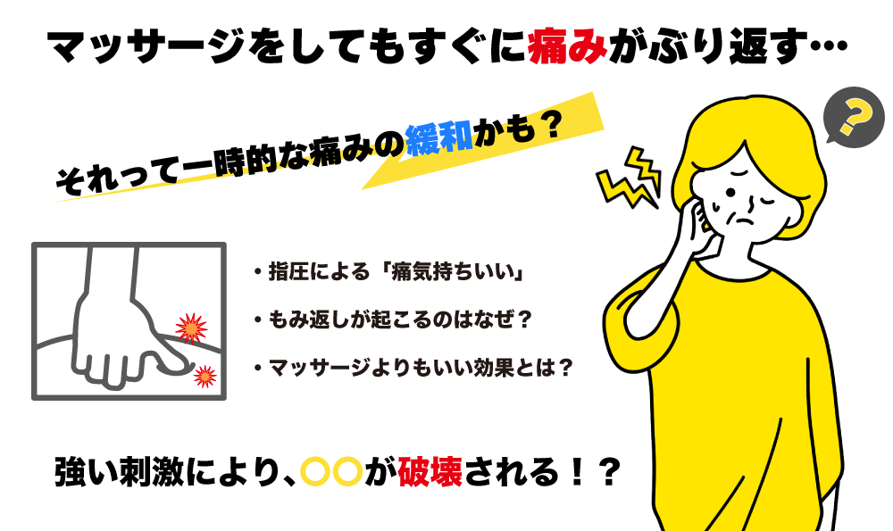 つまり、強い刺激は脳を麻痺させ、一時的に痛みは解消されますが、患部はダメージを受けるため、治りはかえって遅くなるということになります。